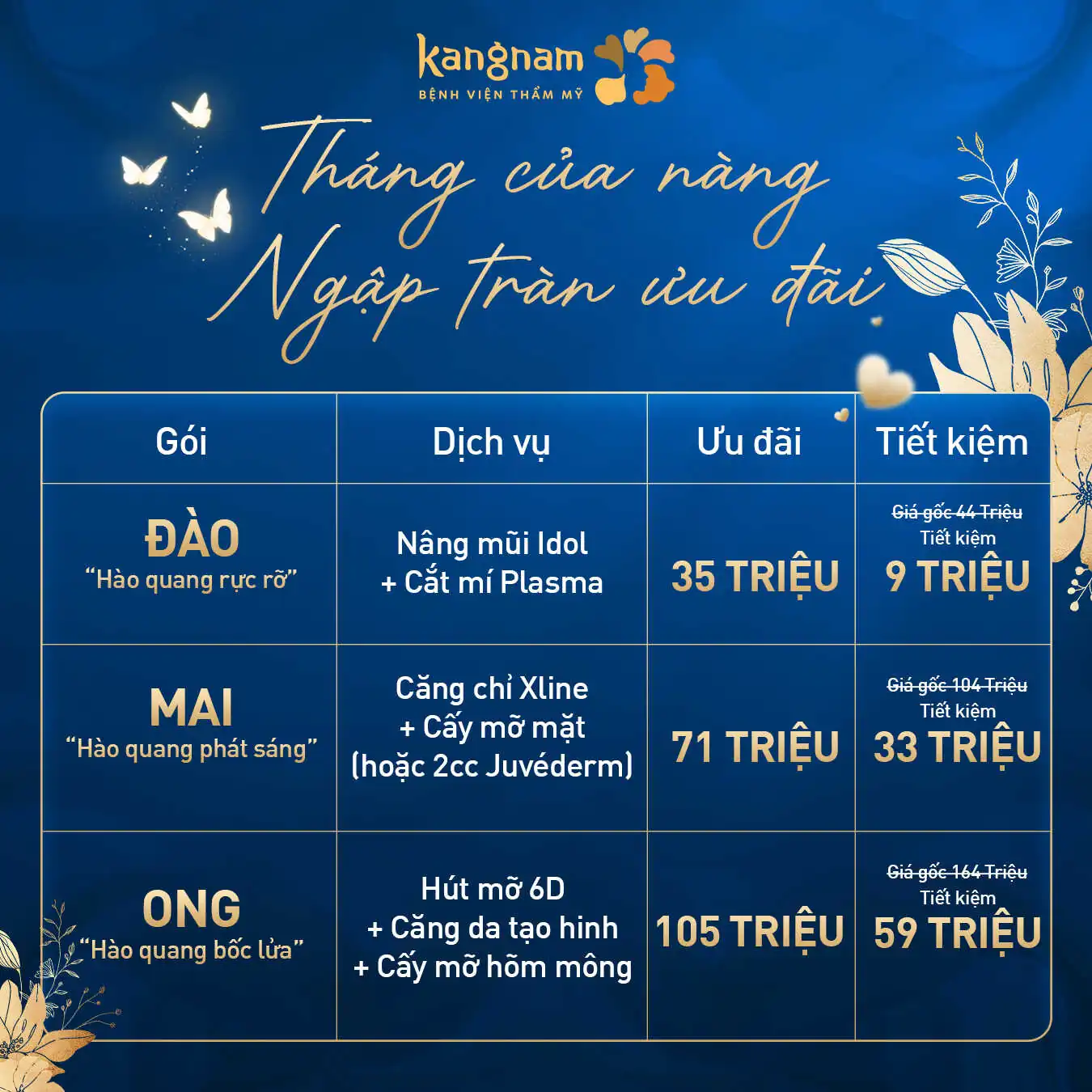 Bên cạnh đó, Kangnam cũng có ưu đãi lên đến 30% các dịch vụ phẫu thuật và 50% các dịch chăm sóc da. Quý khách hàng có thể đến bất kì cơ sở nào của Kangnam trên toàn quốc để nhận ưu đãi dành cho mình trong tháng 3.